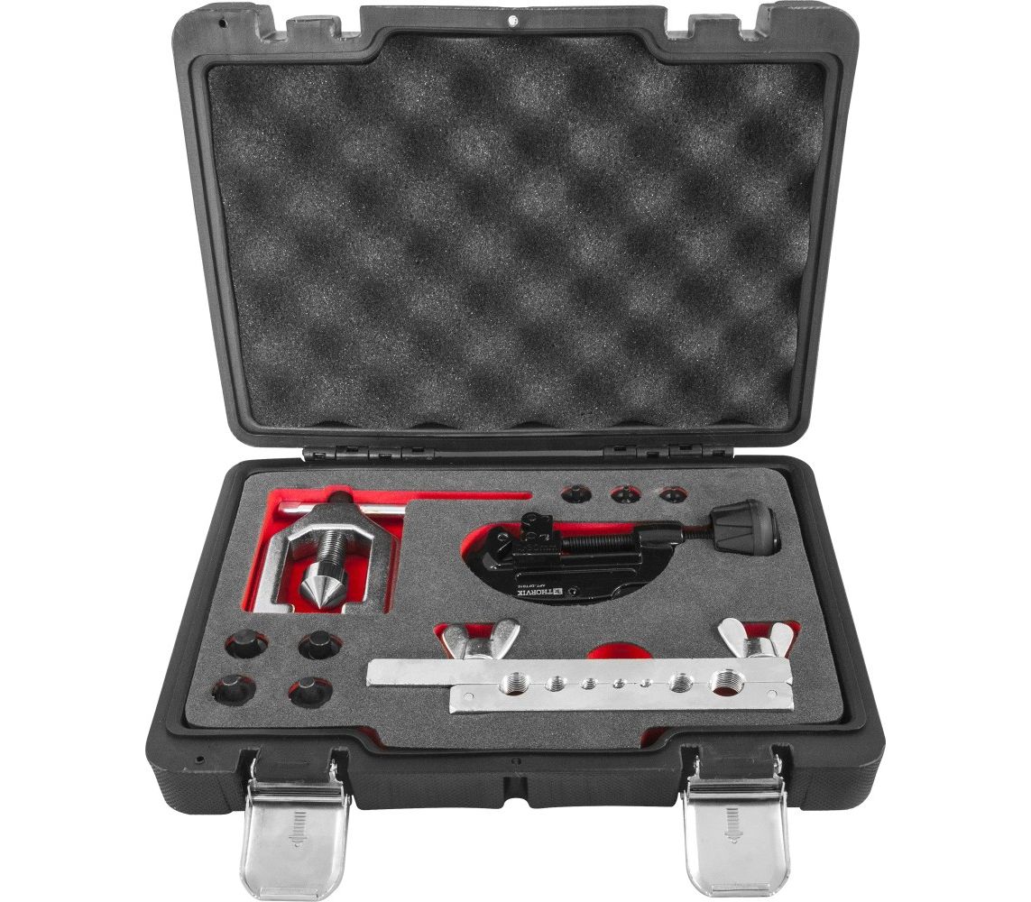 Набор включает в себя перечень инструментов, применяющихся для изготовления элементов гидравлических магистралей автомобиля: систем питания, смазки, кондиционирования, тормозной системы и гидропривода сцепления. Инструменты позволяют обрезать и развальцовывать трубки, изготовленные из меди, алюминия или мягких сортов стали, для соединений со стандартной и усиленной, двойной развальцовкой. Для удобства, детали, входящие в состав набора, хранятся в оригинальном пластиковом кейсе.