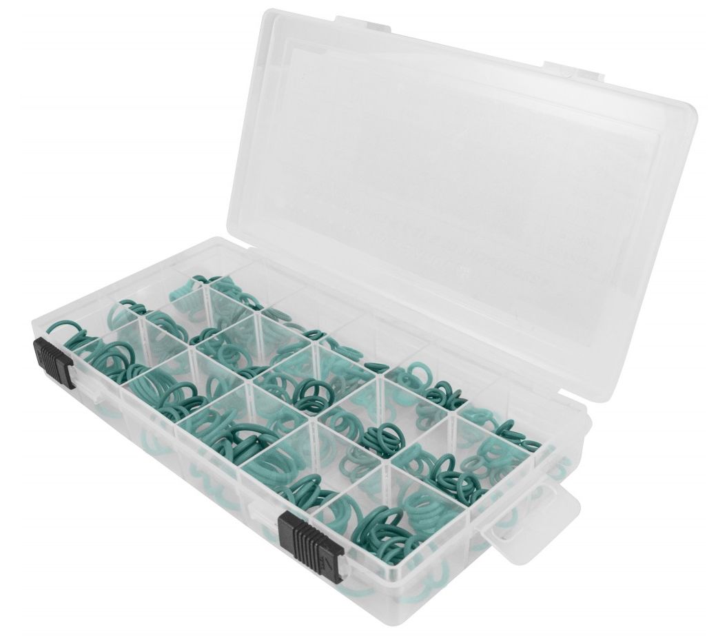 Набор специальных уплотнительных колец, 270 шт, применяющихся в качестве расходных материалов при производстве работ по ремонту и обслуживанию систем кондиционирования автомобилей, использующих хладагенты марок R-12 и R-134A.