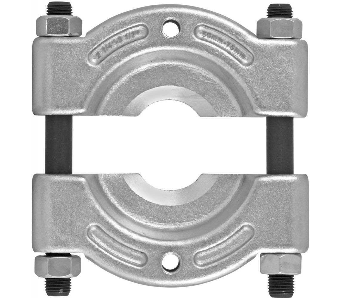 Самая надежная конструкция съемника, практически исключающая срыв захватов с демонтируемой детали и позволяющая прилагать предельные нагрузки, какие только способны выдержать детали тянущей части. К плюсам инструмента также можно отнести его способность захватывать демонтируемые детали, установленные с минимальным зазором между деталью и корпусом узла или агрегата и «страгивать» их при этом коническими выточками съемника при затяжке его шпилек, возможность использования сепаратора в качестве оправки при работе на прессе. К минусам – необходимость приобретения тянущей части, узкий рабочий диапазон и ограничения по доступу к демонтируемым деталям. Полукольца съемника изготавливаются из стали SCM415, закаленной до твердости HRC 42-45. Шпильки соответствуют классу прочности 8.8