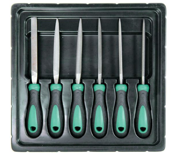Набор 100 мм надфилей с бархатной насечкой, плотностью 28 зубьев на см. Твердость рабочей поверхности изделий 64-66 HRC. В наборе содержатся плоский, плоский пазовый, полукруглый пазовый, круглый, квадратный и треугольный зауженный надфили. Изделия снабжены резинополимерными рукоятками.
