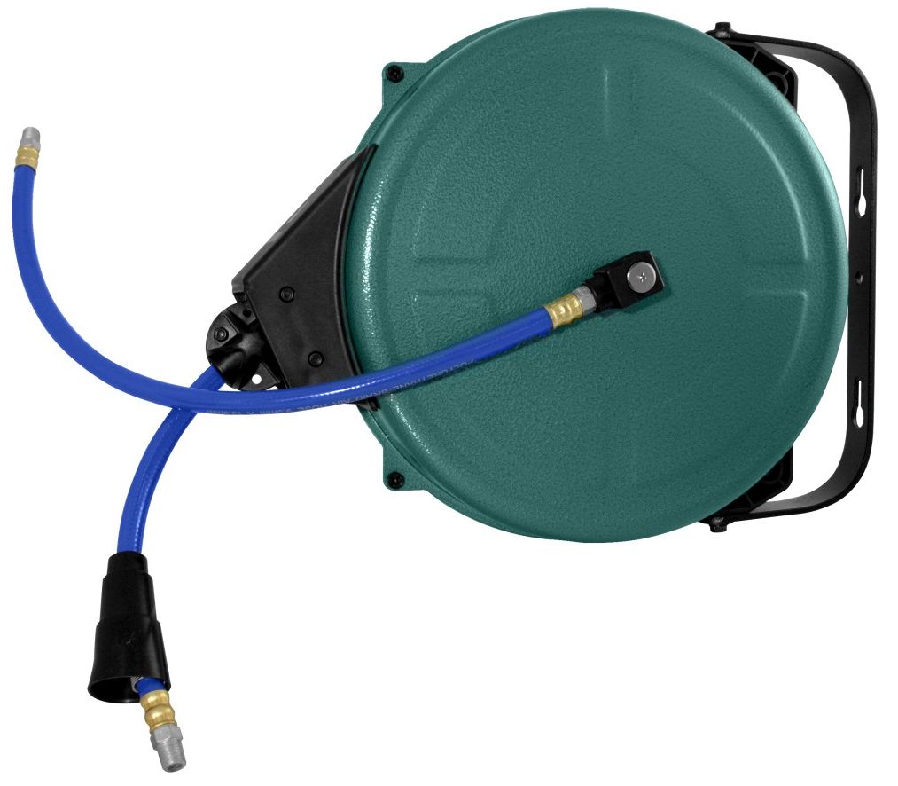 Пневматический шланг, изготовленный из армированного полиуретана. Внутренний диаметр 9.5 мм, внешний 13.5 мм, общая длина 12 м. Преимуществом изделия является возможность использовать нужную для производства работы длину шланга и компактное его хранение в корпусе. Шланг без особых усилий извлекается из корпуса на нужную длину, фиксируется и автоматически возвращается после ослабления кулачкового фиксатора вылета по окончании работ. Изделие снабжено кронштейном для подвеса или установки на вертикальной поверхности (стене), сохраняя при этом возможность поворачиваться в горизонтальной плоскости на угол 180°. Шланг подключения к магистрали снабжен штуцером с резьбовой частью 1/4" BSP, шланг подключения к потребителю дополнительно снабжен быстросъемным соединением для штуцеров SMC.