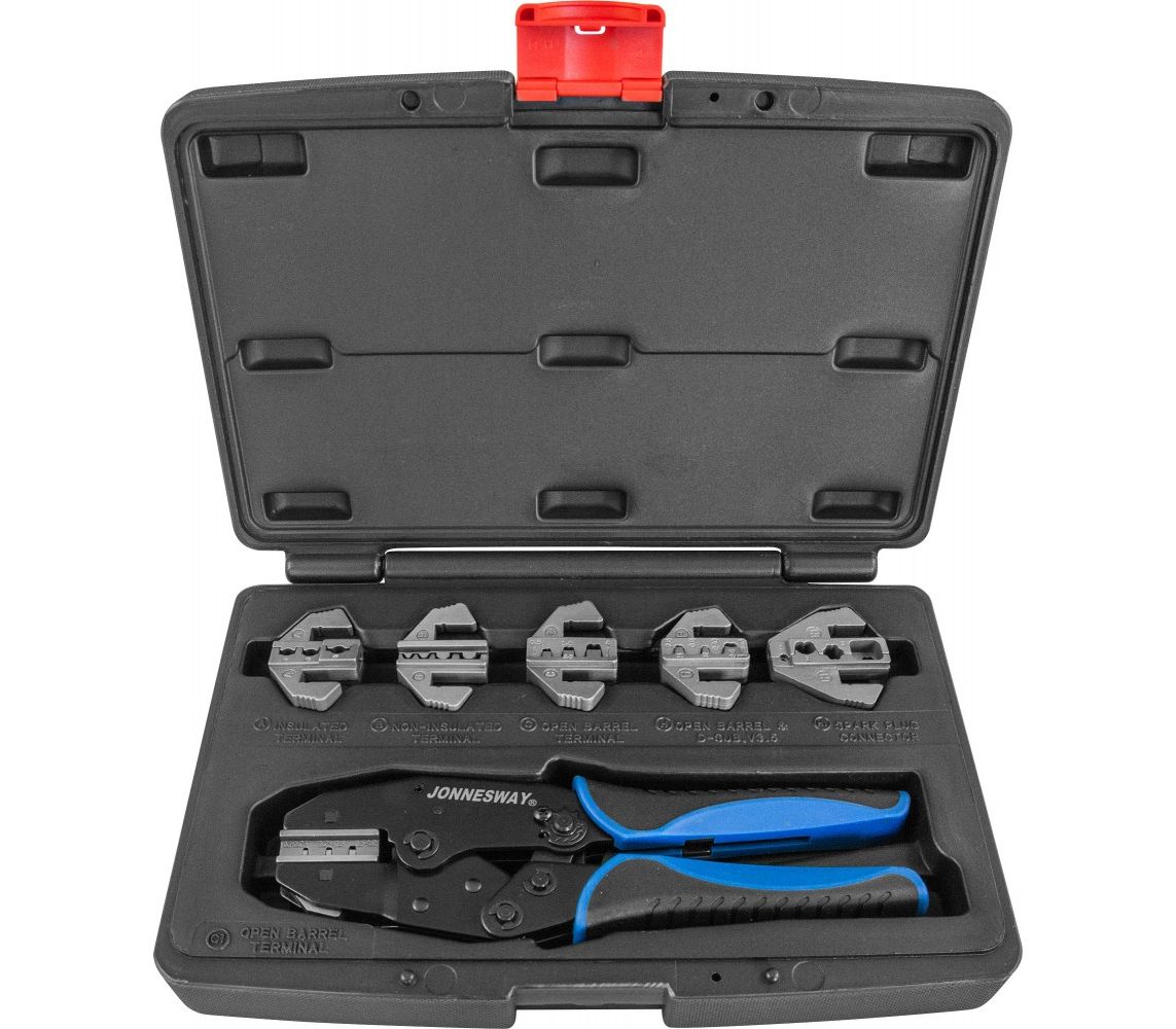 Главная/Каталог/ПРОФЕССИОНАЛЬНЫЙ ИНСТРУМЕНТ(Продукция Прайд)/Jonnesway/Шарнирно-губцевый инструмент/Инструмент для электротехнических работ/AR030058 Пресс-клещи обжимные со вставками в наборе, 7 предметов