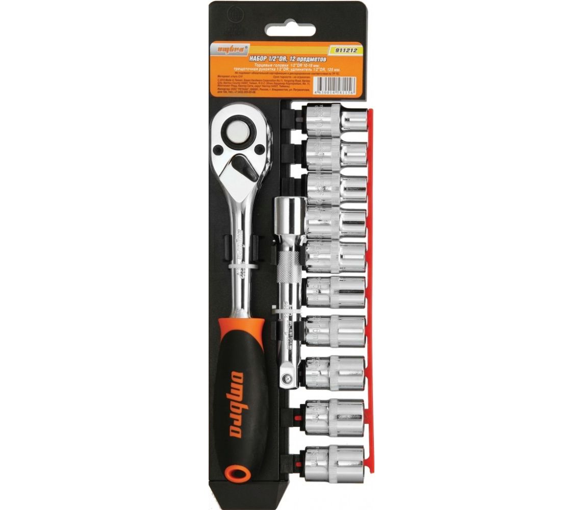 Главная/Каталог/ПРОФЕССИОНАЛЬНЫЙ ИНСТРУМЕНТ(Продукция Прайд)/Ombra/Головки торцевые/Наборы головок/911212 Набор головок торцевых с аксессуарами 1/2"DR, 10-19 мм, 12 предметов