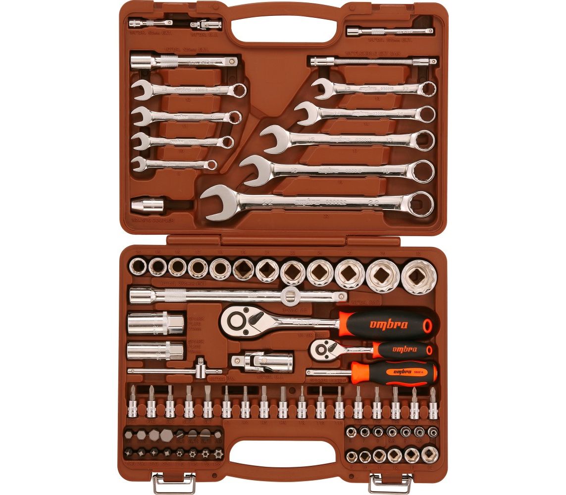 Главная/Каталог/ПРОФЕССИОНАЛЬНЫЙ ИНСТРУМЕНТ(Продукция Прайд)/Ombra/Наборы инструмента/Наборы инструмента универсальные/OMT82S12 Набор инструмента универсальный 1/4", 1/2"DR с головками торцевыми 12-гранными 1/2"DR, 82 предмета