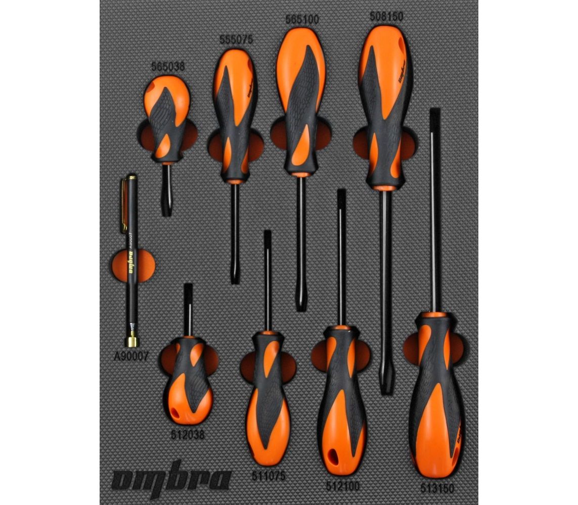 Главная/Каталог/ПРОФЕССИОНАЛЬНЫЙ ИНСТРУМЕНТ(Продукция Прайд)/Ombra/Наборы инструмента/Наборы инструмента в ложементе/OMT9STE Набор отверток стержневых Basic в EVA ложементе 280х375 мм, 9 предметов