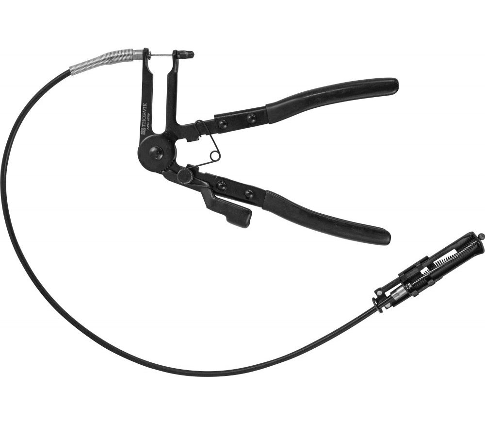 СПЕЦИАЛЬНЫЙ ИНСТРУМЕНТ С ЗАЖИМОМ, УСТАНОВЛЕННЫМ НА ГИБКОМ ТРОСЕ, ПОЗВОЛЯЮЩЕМ ИСПОЛЬЗОВАТЬ ИЗДЕЛИЕ ДЛЯ СНЯТИЯ ПЛОСКИХ ПРУЖИННЫХ ХОМУТОВ СИСТЕМ ОХЛОЖДЕНИЯ В КРАЙНЕ ОСЛОЖНЕННЫХ И СКРЫТЫХ МЕСТАХ ПОДКАПОТНОГО ПРОСТРАНСТВА. РУКОЯТКИ ИНСТРУМЕНТА СНАБЖЕНЫ ФИКСАТОРОМ ПОЛОЖЕНИЯ ЗАЖИМА, ОСВОБОЖДАЮЩИМ ОПЕРАТОРА ОТ НЕОБХОДИМОСТИ ПОСТОЯННО ИХ УДЕРЖИВАТЬ. ИЗДЕЛИЕ ИЗГОТОВЛЕНО ИЗ СТАЛИ, ИМЕЕТ ЗАЩИТНОЕ ПОКРЫТИЕ И ОБЛИВНЫЕ ПВХ ЧЕХЛЫ РУКОЯТОК.