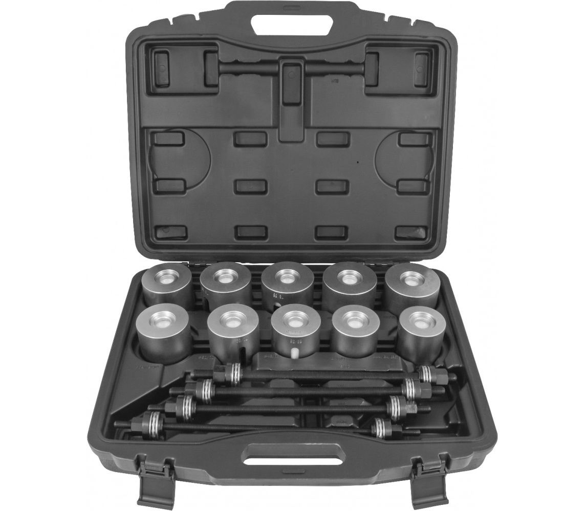 НАБОР ПРЕДНАЗНАЧЕН ДЛЯ ПРОИЗВОДСТВА РАБОТ ПО ЗАМЕНЕ САЙЛЕНТБЛОКОВ ПРИ ОБСЛУЖИВАНИИ ПОДВЕСКИ АВТОМОБИЛЕЙ. ШИРОКИЙ ДИАПАЗОН РАЗМЕРОВ ОПРАВОК, ВХОДЯЩИХ В КОМПЛЕКТ НАБОРА, ПОЗВОЛЯЕТ ОБСЛУЖИВАТЬ МАКСИМАЛЬНО ВОЗМОЖНЫЙ СПЕКТР ТРАНСПОРТНЫХ СРЕДСТВ.
