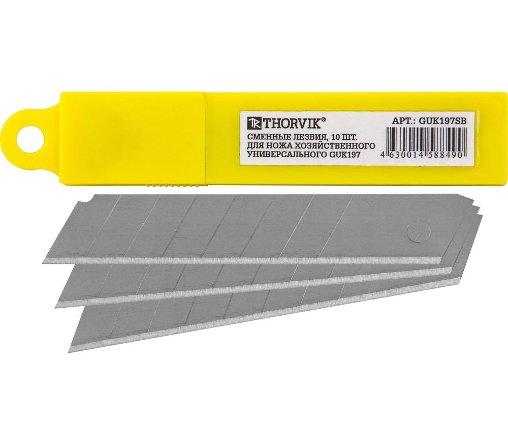 Главная/Каталог/ПРОФЕССИОНАЛЬНЫЙ ИНСТРУМЕНТ(Продукция Прайд)/Thorvik/Режущий инструмент/Ножи хозяйственные универсальные/GUK197SB Сменные лезвия для ножа хозяйственного универсального GUK197, 10 шт.