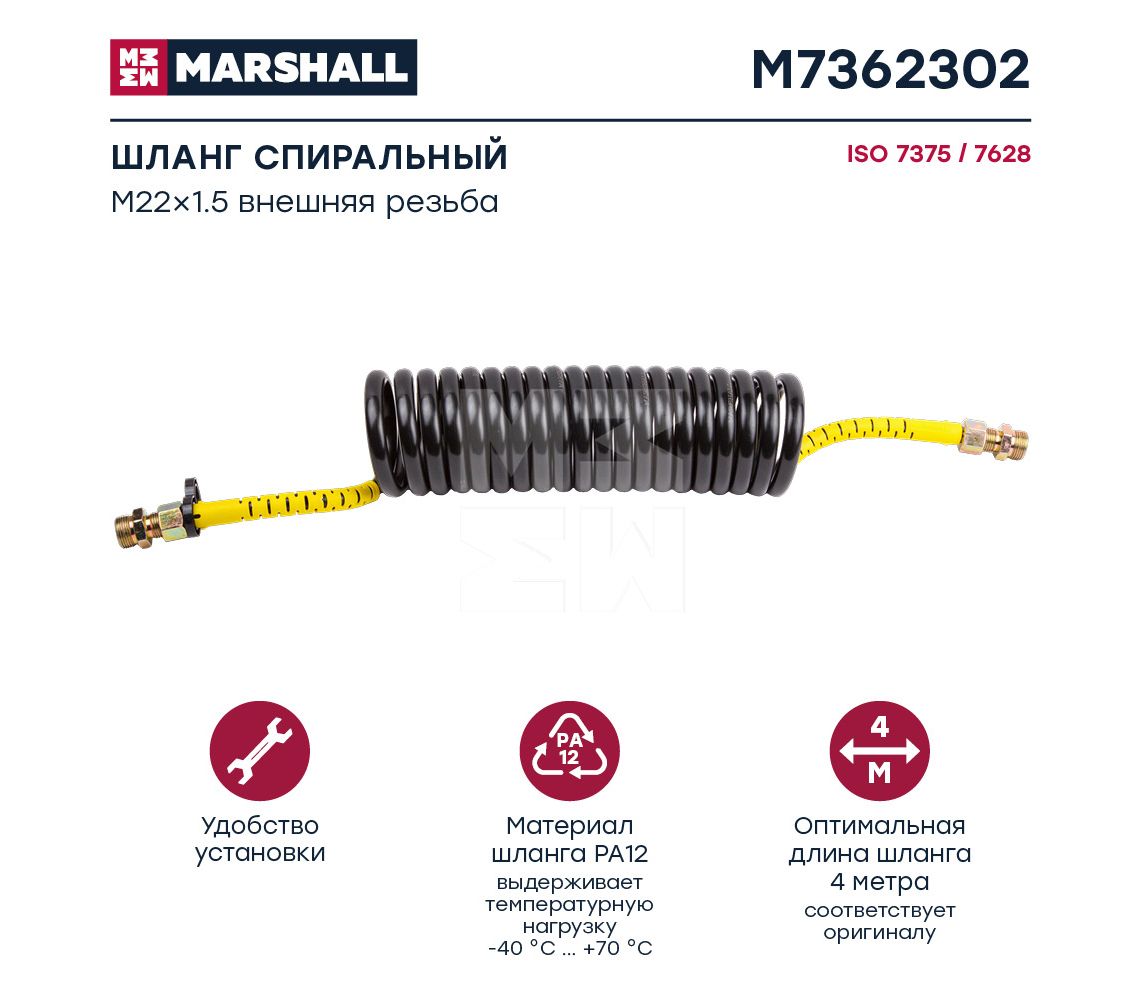 M7362302 Шланг спиральный желтый, штуцеры M22x1.5 (2), рабочая длина L = 4 м КАМАЗ